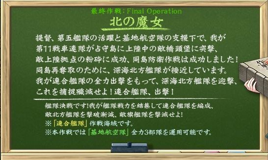 いよいよ艦これの2017年春のイベント「出撃!北東方面 第五艦隊」も最終決戦を 迎えます。 燕雀提督、これまでの作戦ではすべて甲作戦で任務を遂行してきましたが、 さてさて燕雀提督の決断や如何に! ※ まあ、ここまで来たら目指すは当然ALL甲ですよねっ! それでは最終決戦の作戦概要を確認しましょう。大淀さんによれば、基地航空隊とともに鎮守府の全戦力を投入し、総力をあげて 連合艦隊で敵の北方艦隊を殲滅しなければなりません。 しかも情報部(先にイベントを完了した他のプレイヤーの方々ですねw)からの 情報によれば