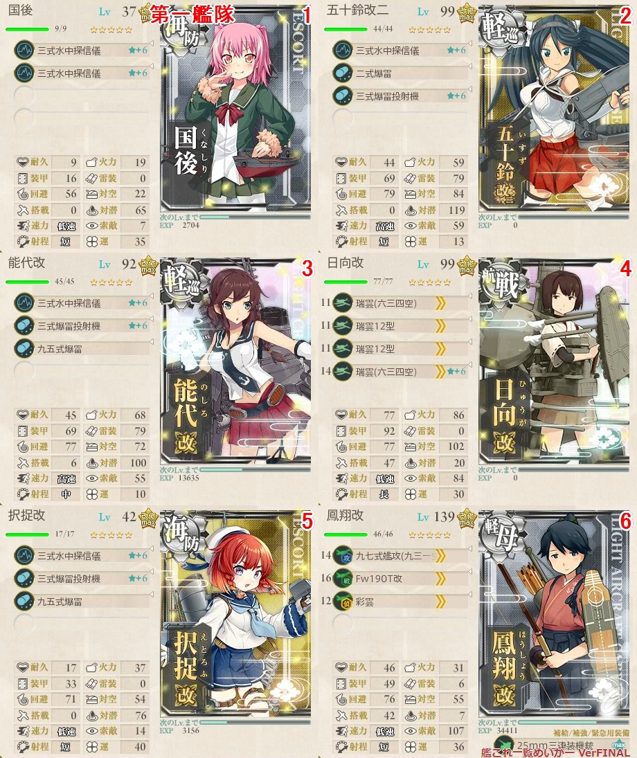 このように先制対潜攻撃が可能な軽巡2隻を軸に、駆逐艦枠にやはり先制対潜 攻撃が可能な海防艦の2隻、2巡目要員として日向師匠、そして彩雲搭載要員と してお艦を入れた編成としました。 海防艦とお艦については戦力として見ると若干不安を禁じえませんが、まあここ で使うのでなければ今後も出番はないだろうと判断して、とりあえずこれで行って みてダメならそのとき考えるというスタンスにしました。
