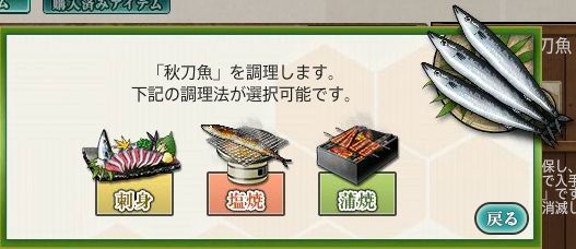 塩焼きにすれば、秋刀魚30尾から開発資材18、改修資材6が獲得できる