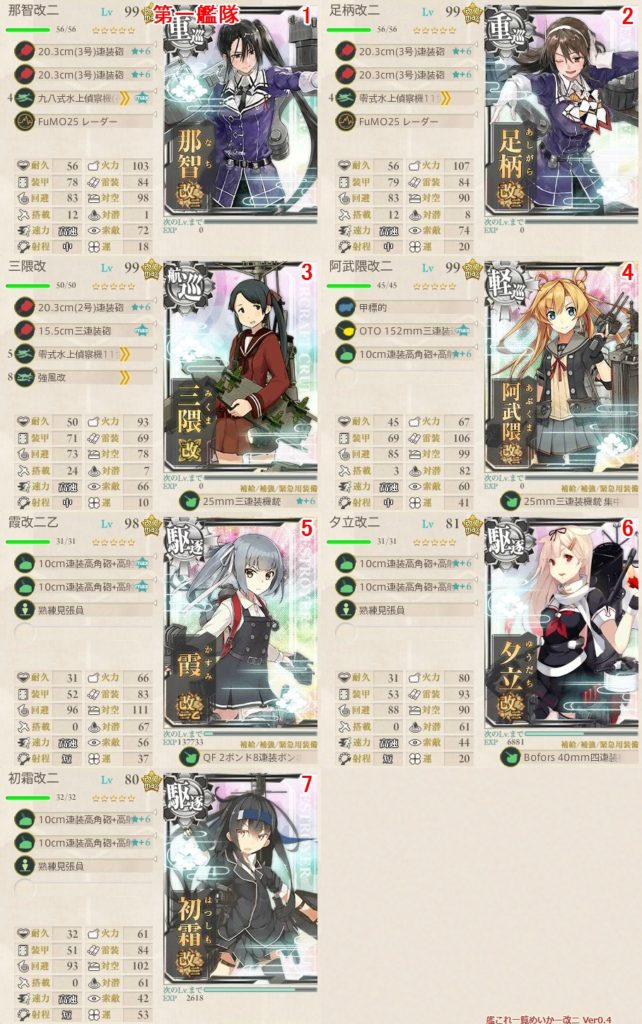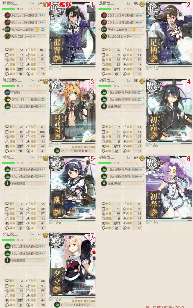 なお、道中支援は軽空1戦2重巡1駆2で間宮&伊良湖でキラ付けして