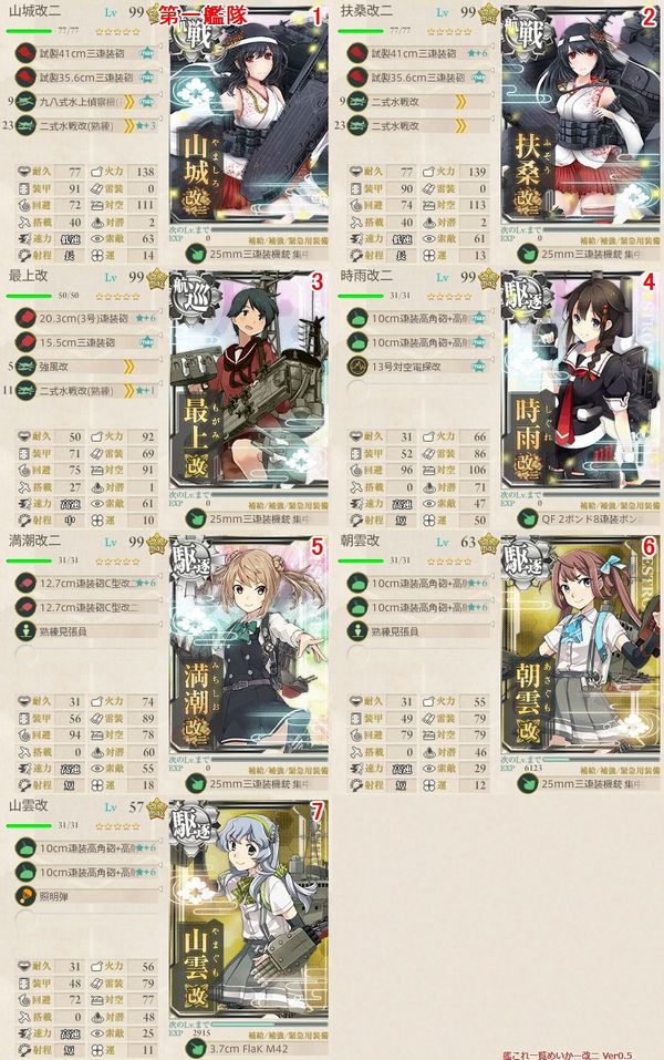 不幸姉妹ともがみんで索敵値を稼ぎ、時雨くんで対空、あとはPT対策といった