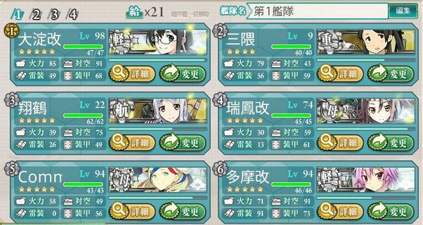 の編成の駆逐艦2隻を軽巡2隻に入れ替えました。