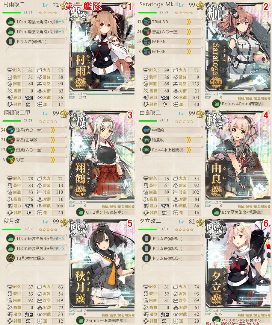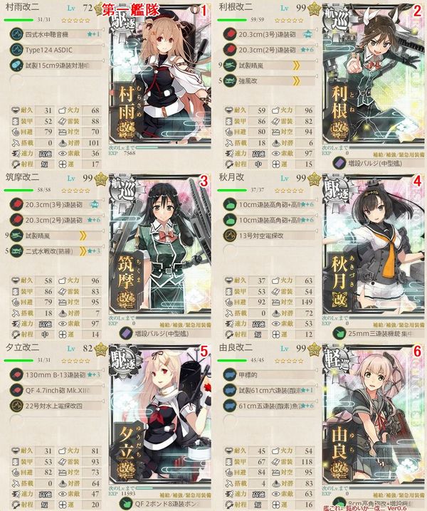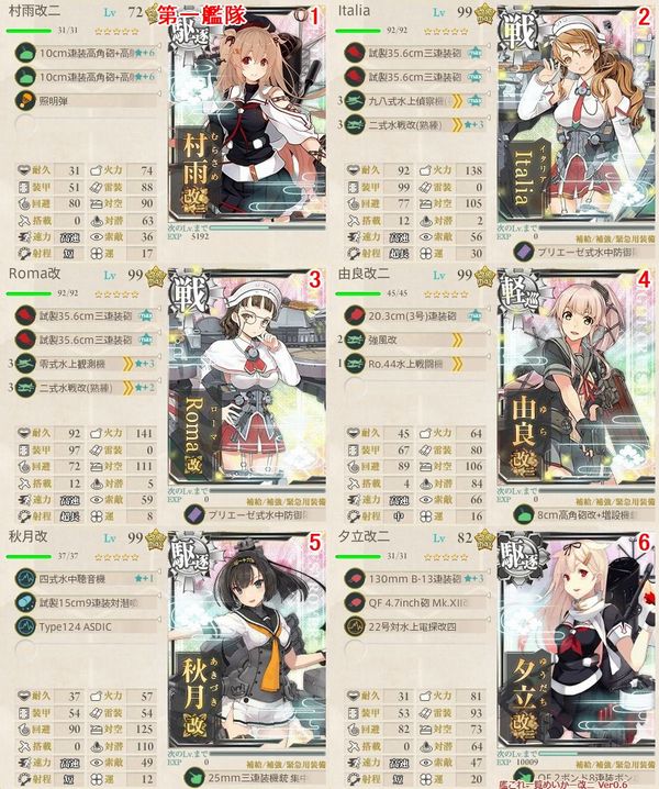 (72)、由良改二(99)、夕立改二(82)、春雨改(30)、五月雨改(31)、