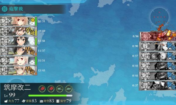 初回のアタックで無事ボスマスに到達、夜戦にもつれ込みしましたが