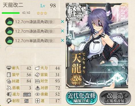 龍田改二との違いは、大発系搭載不可、大型探照灯搭載可と