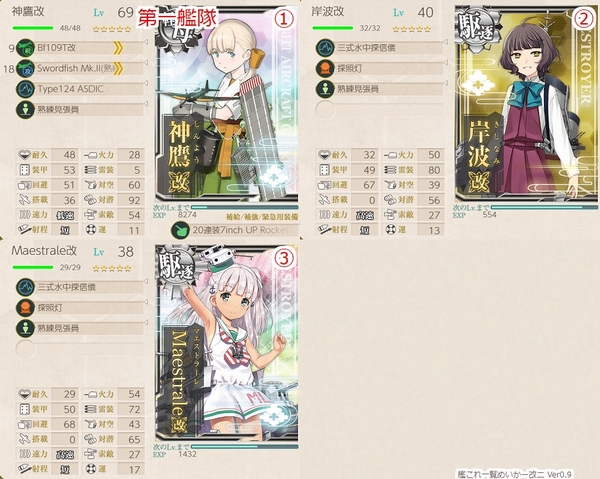 この編成で3-3海域の上ルート進行で1周回でドロップ機会2回を狙います。