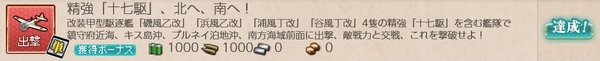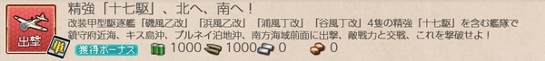 【精強「十七駆」、北へ、南へ!】 最後はこちらの出撃任務です。 ご覧のとおり、十七駆の4隻を含む艦隊で、1-5・3-2・7-1・5-1海域で それぞれA勝利以上を獲得するというものです。 一七駆の駆逐艦4隻が必須な点がやや不安ですが、◯改化してり、 それなりの練度はあることから、攻略海域から判断してもそれほど 高難度ではないと思われますが.....。 【1-5海域】 はじめに1-5海域は