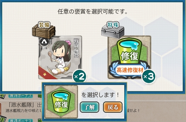 褒賞の二択はどちらでもいい感じがしますが、当鎮守府ではバケツを