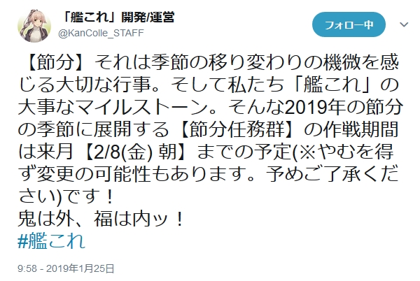 運営電文により2月8日までが節分任務群の作戦期間と公表された