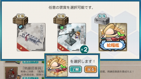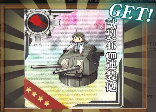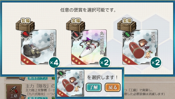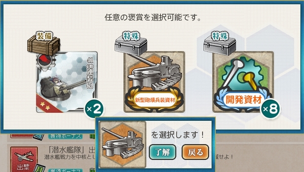 これらの褒賞が選択できます。 当鎮守府では試製46cm連装砲・試製南山ともに未配備のため、両者の選択 に悩みましたが、先行する諸提督の情報により砲の方は次の任務の褒賞でも 選択できるということだったので