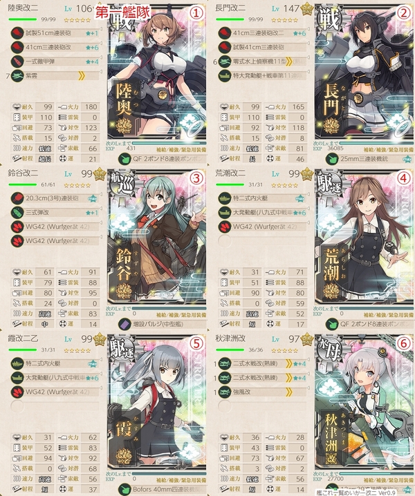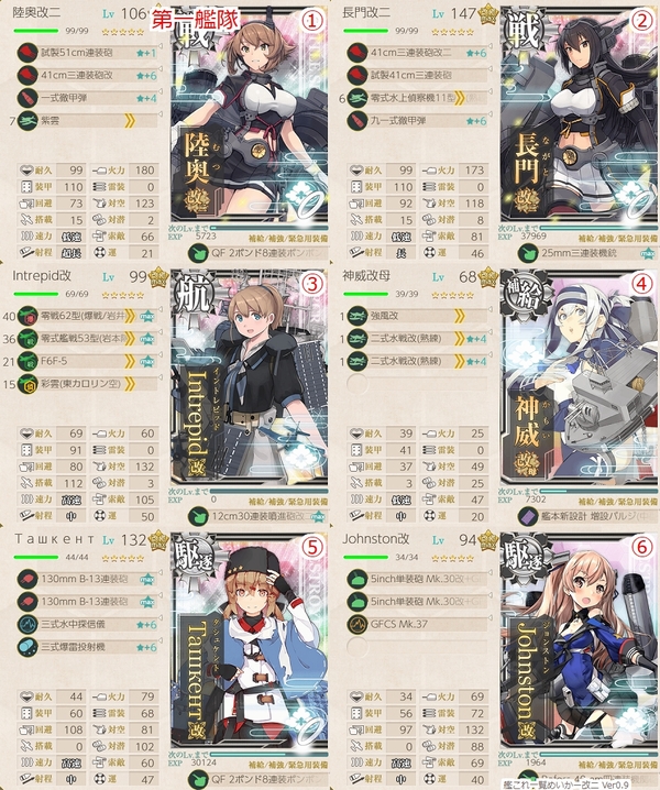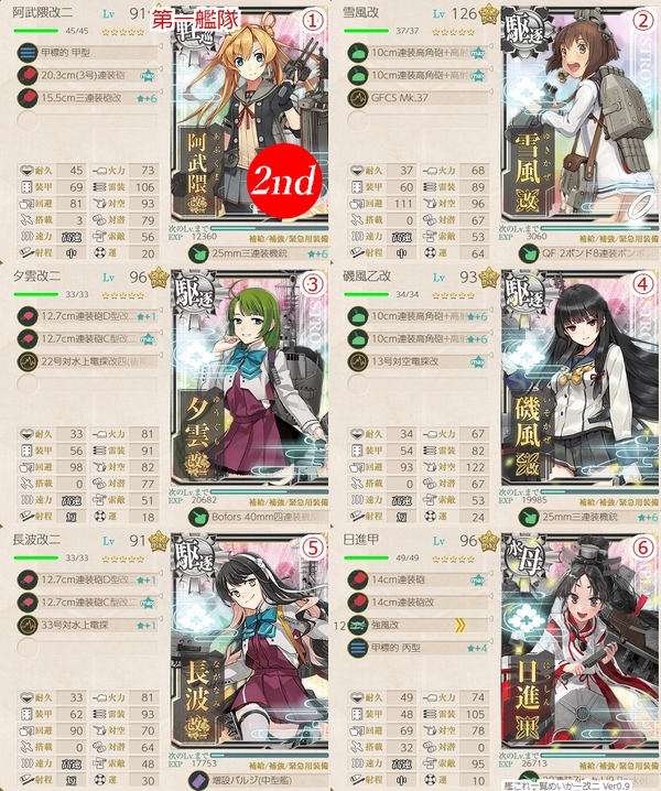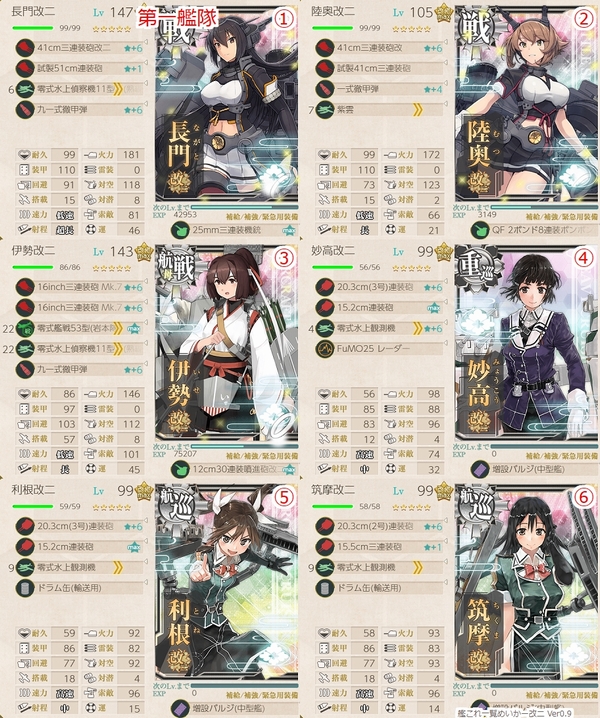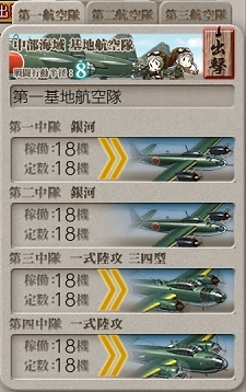 この編成で挑みます。 ルート進行上のドラム缶2隻分搭載とJマスでの索敵値判定以外は特に気に する点はないと思います。