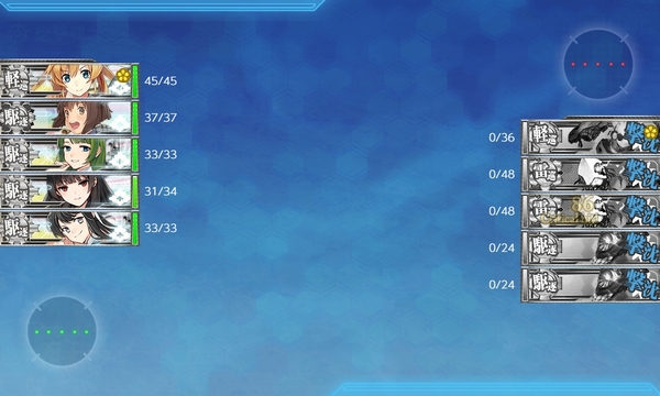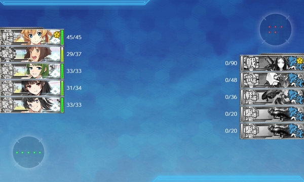 この編成で挑みました。 1戦目は先制対潜可2隻で大破の可能性は少ないこの編成、2戦目のHマスを ながもんタッチ発動でなんとか凌ぐという考えですが.....。 先に過信と記したとおり、Hマスで発動しないと長門型2隻以外の4隻がボッコ ボコにされてしまう可能性が高いです(苦笑)。 今回は4回目のアタックでボスマスに到達しましたが、3回はHマスでの大破撤退 でした。 まあ、言い換えれば