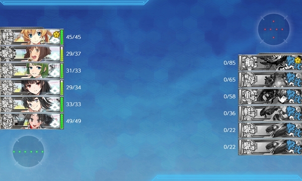 ボス戦も比較的楽にS勝利獲得です。 【4-5海域】 ながもんタッチが有効であると過信した(笑)管理人、続く4-5でも使用すべく、 道中2戦ルート進行となる戦2・軽巡1・駆逐3の