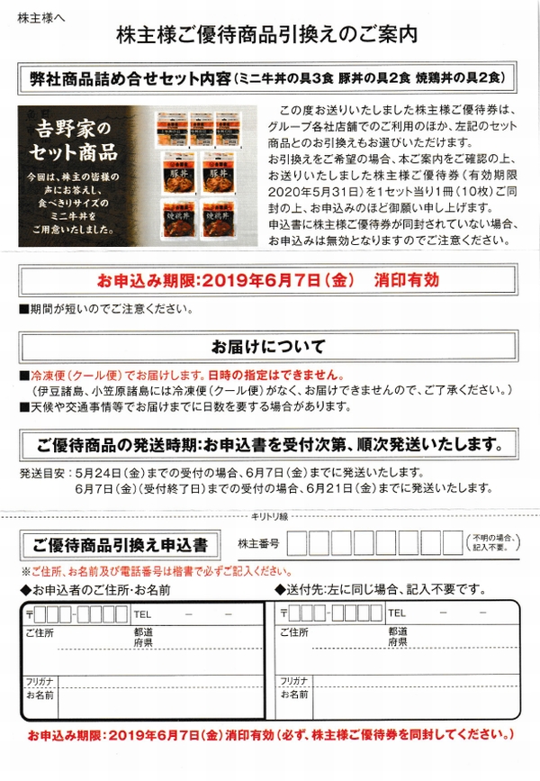 株主優待制度は存じてましたが、株を買ったことがないので具体的事例は知らずにいましたが、株主優待品を始めて見ました。吉野家の金券3,000円分はちょっとうれしいんではないでしょうか。ま、投資した金額と照らしてどうかということはありますが。いくら以上の株式を保有すればよいのでしょうか。私共の手の届く範囲なのでしょうか。やっぱ、うらやましいですね。