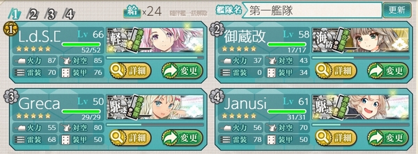 というわけでここからが本題、E-2-Dでのレベリングです。 やり方についてはぜかましねっと艦これ!さんのこの記事をはじめ、諸提督 方のブログやツイッター等をご参照いただくとして、ざっくりいうと水母・あきつ丸・ 大鯨を除外した空母機動部隊か輸送護衛部隊を編成してE-2でスタート地点1 から出撃し、Dの対潜マスで敵潜を撃破する作業を繰り返します。 敵潜の撃破については 1.Dマスに基地航空隊(東海部隊)を出撃させる 2.第二艦隊に先制対潜可な艦娘を揃える のいずれかで、赤疲労状態でもほぼほぼノーダメで敵潜撃破が可能です。 管理人は当初空母機動部隊&東海部隊で出撃しました。 理由は2つあり、①牧場用の鶴姉妹の育成、②東海部隊での敵潜殲滅により 第一、第二艦隊ともに旗艦がMVPを獲得、すなわちJanusとGrecaleを集中して 育成することができるからです。 しかし―――――東海部隊を出すと地味に燃料を食いますし、なにより操作が 非常に面倒です(笑)。 というわけで、輸送護衛部隊&基地航空隊未出撃に切り替えました。 なお、基地航空隊を未出撃にしてから赤疲労状態のままで(たしかw)124回 出撃しましたが、被ダメは2回でしたので、バケツは消費しなくて済みます。 輸送護衛部隊にしたことで第二艦隊旗艦からGrecaleを外す必要がありました が、随伴でもそこそこ経験値は獲得できますのでほどなくGrecaleが改に、そしてほぼ同じタイミングで